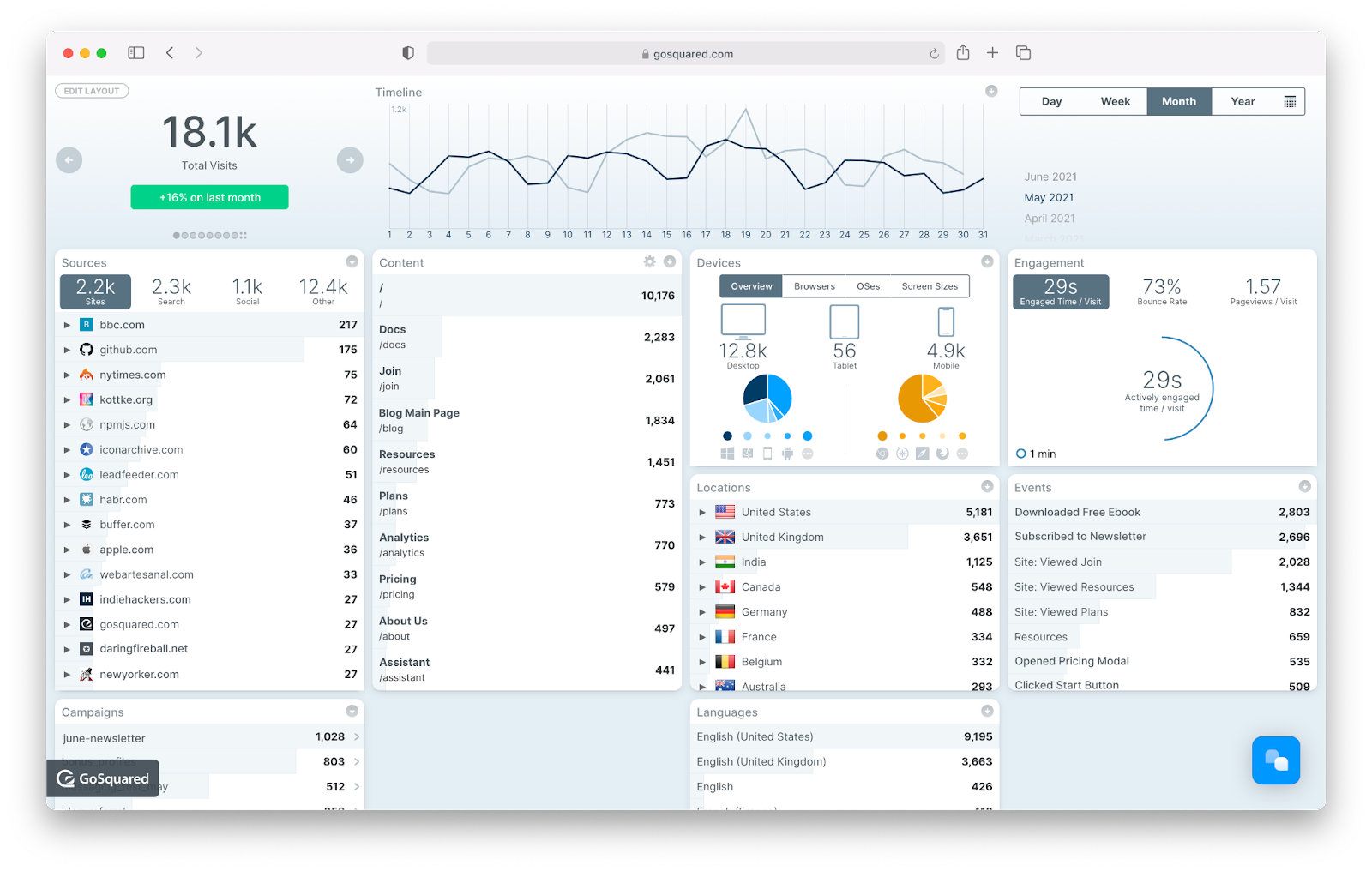 GoSquared Analytics is a privacy-focused web analytics tool with many functionalities similar to Google Analytics. The customizable dashboard allows for easy access to essential data, and users can track events and set up campaigns. GoSquared offers a 7-day free trial, with pricing at $9/month for 100,000 pageviews afterward.