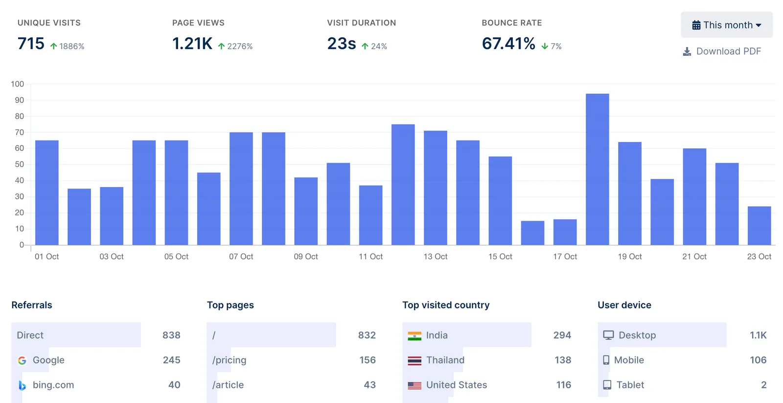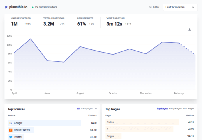 Plausible is an open-source, lightweight web analytics tool designed for privacy and GDPR compliance. With a user-friendly dashboard, Plausible provides essential stats like unique visits, pageviews, bounce rate, and visit duration. The tool also includes goal and event tracking features.