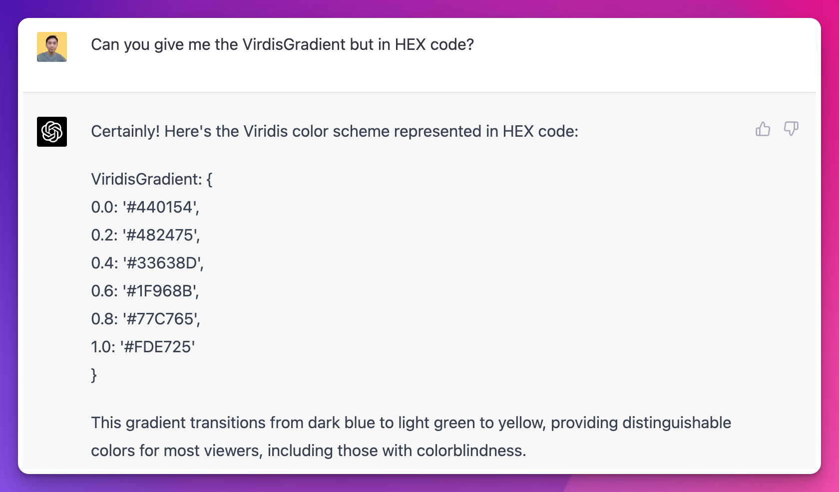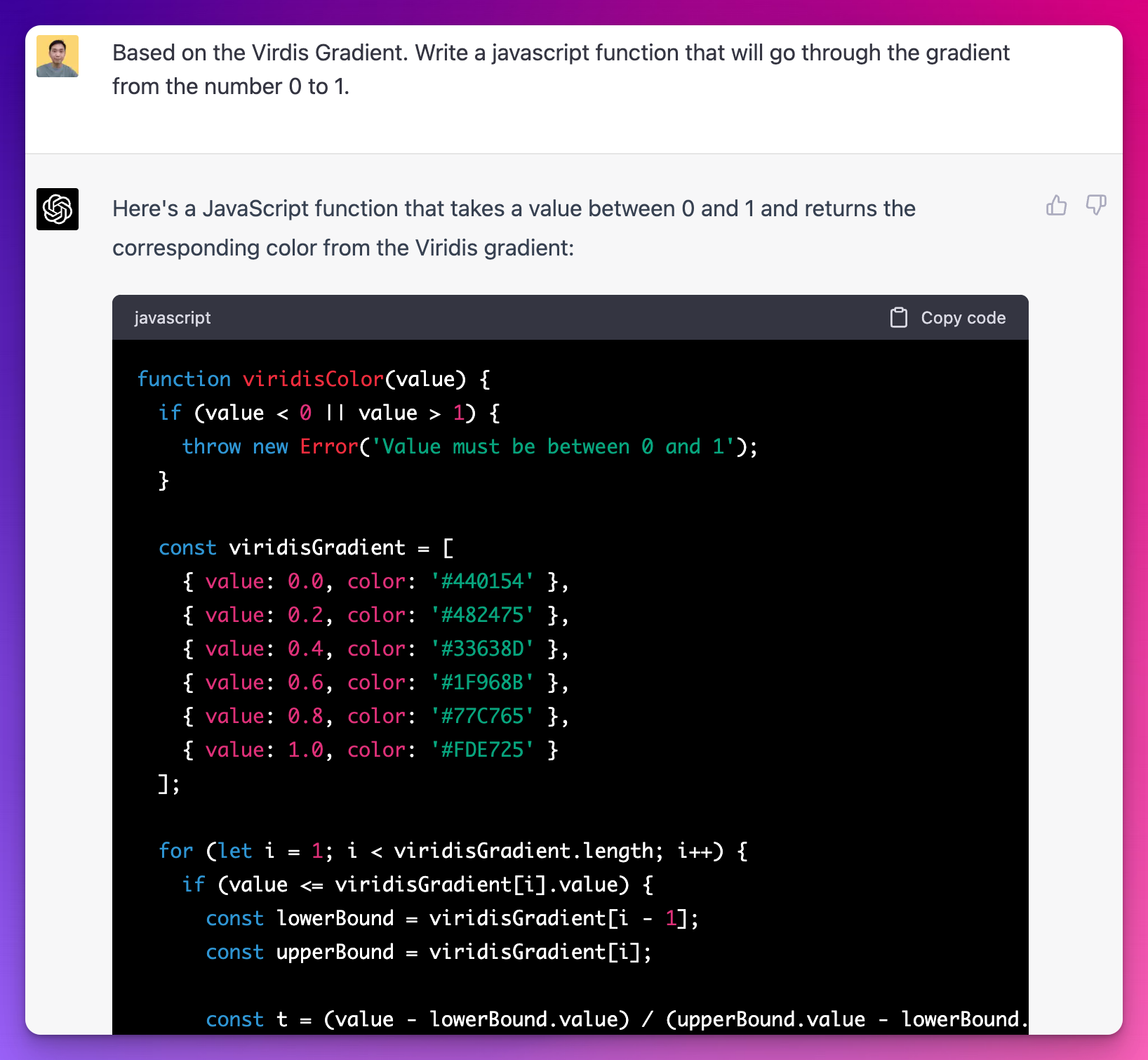 FYI, GPT-4 chose the Viridis color scheme, which uses colors that smoothly transition from dark blue to bright yellow, making it easier for colorblind users to differentiate. It even went ahead and transformed that color scheme into a JavaScript function for me.