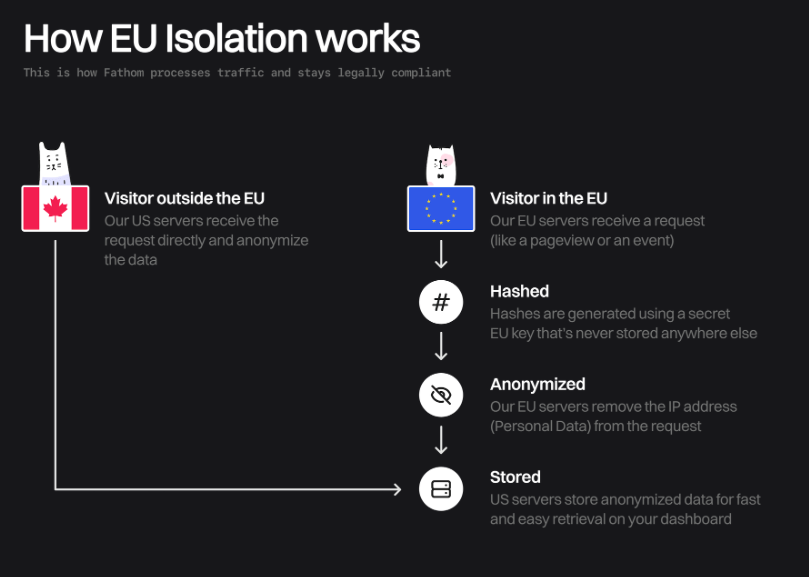 On the other hand, Fathom Analytics is a Canadian corporation that ensures privacy law compliance via EU isolation. That is, all your EU traffic is processed by their German provider (Hetzner), hence it is also protected by EU's privacy laws.