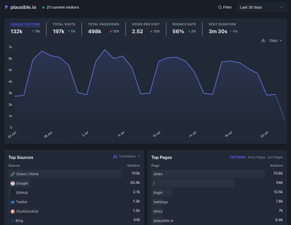 - Simple dashboard: Plausible's dashboard is clean and easy to understand, focusing on the essential metrics without overwhelming you with data.