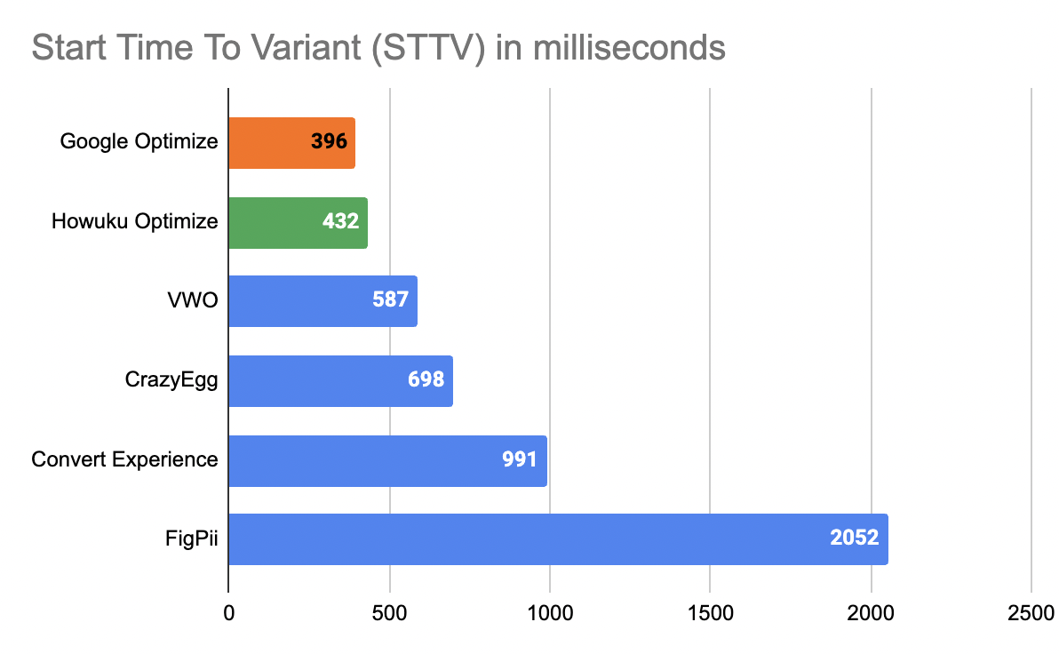 - VWO, CrazyEgg, and Convert.com had STTV times of 587ms, 698ms, and 991ms respectively