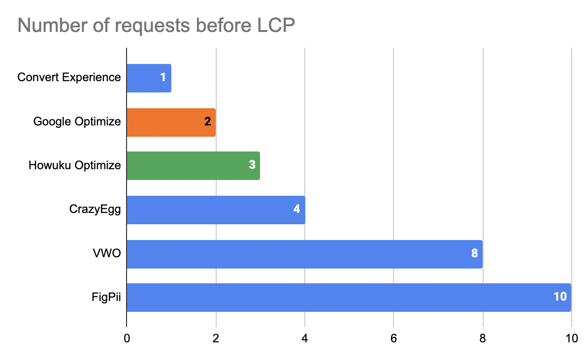 We compared the following popular A/B testing tools: Mida.so, Google Optimize, VWO, CrazyEgg, Convert Experience, CrazyEgg, and FigPii. The tools were evaluated based on their Load Content Paint (LCP), Start Time To Variant (STTV), Number of requests, and their uncompressed size.