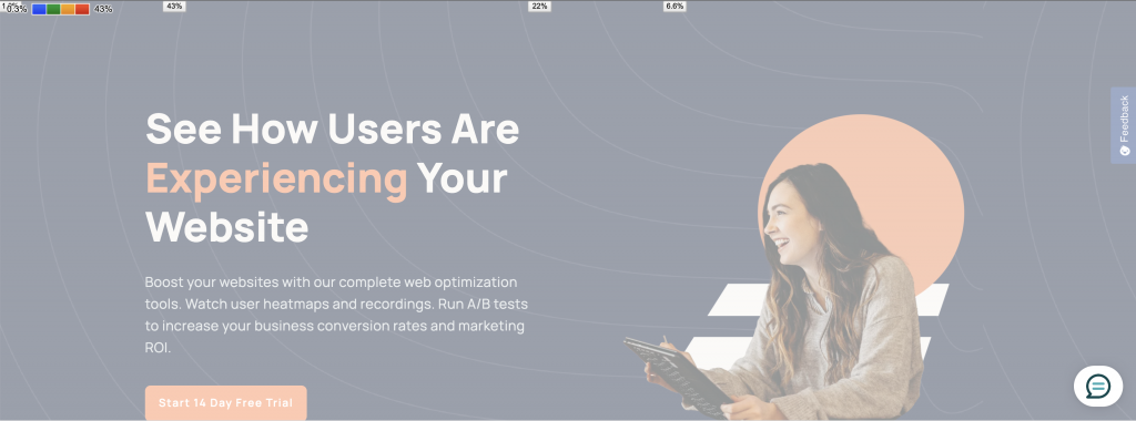 You can start using the Heatmap on your website by clicking on the Message Bubble icon, and it will show you the percentage of clicks threshold you get on each of the elements on your site.