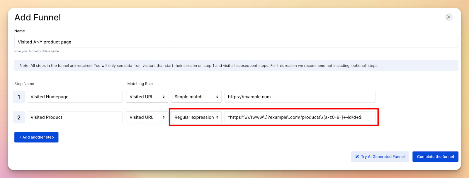 Conversion funnels in Howuku enable you to visualize and analyze the user journey through your website. By using regex patterns, you can create funnels that include multiple URLs with a specific pattern.