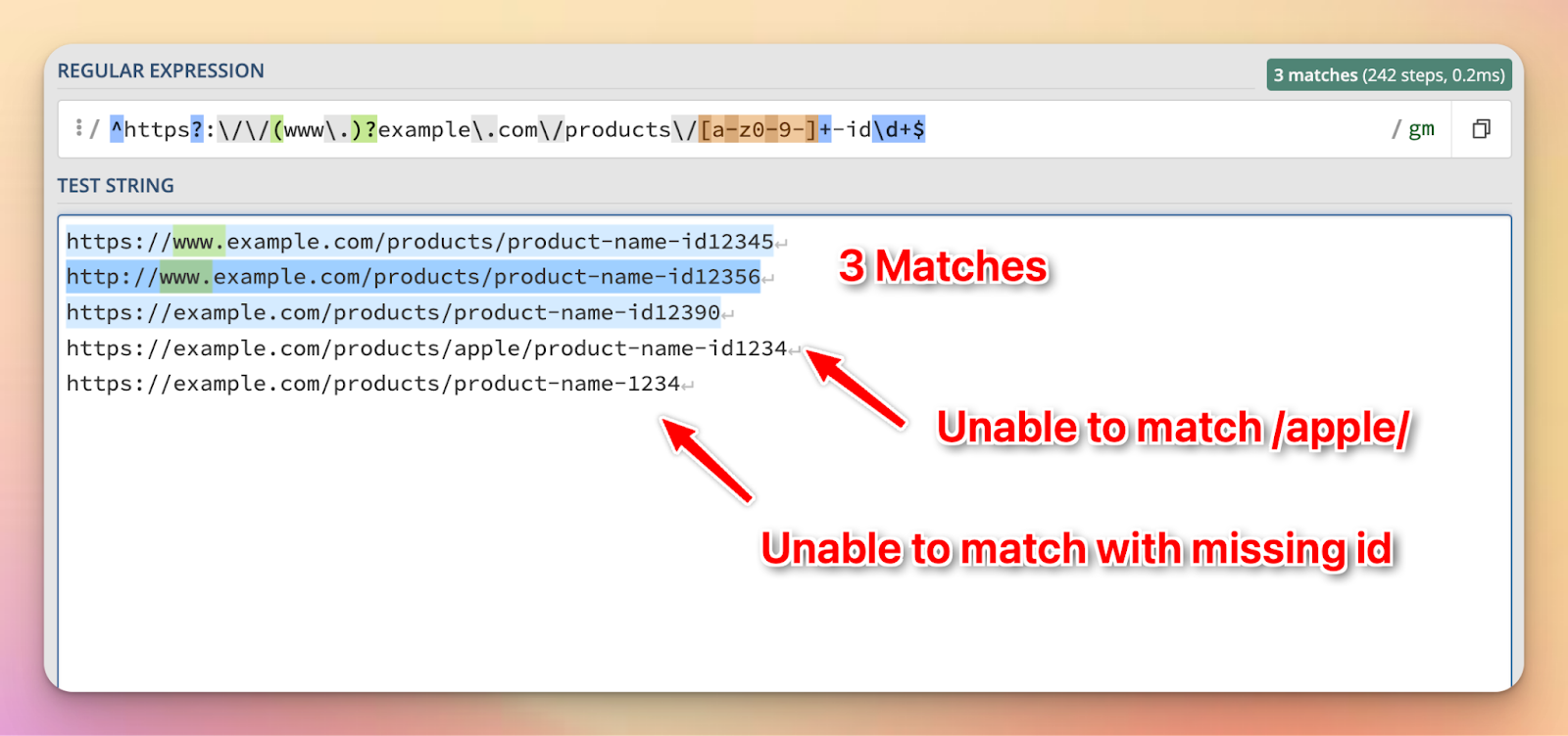 Suppose you want to match URLs that belong to the domain example.com. The following regex pattern will do the trick:
