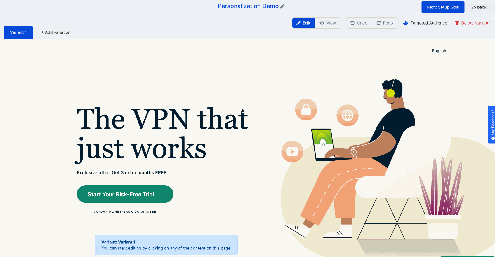 Just click on the copy that you wanted to change, and adding {{city}} into the copy such as “I’m determined to make a business in {{city}} successful” or “The VPN that works for {{city}}”.