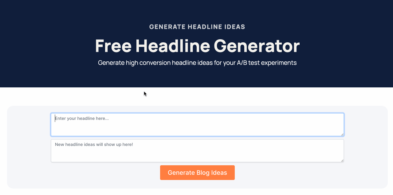 Our free headline generator will help you come up with brilliant headline ideas to help you get more signups and subscriptions. Generate high conversion headline ideas for your A/B test experiments today.