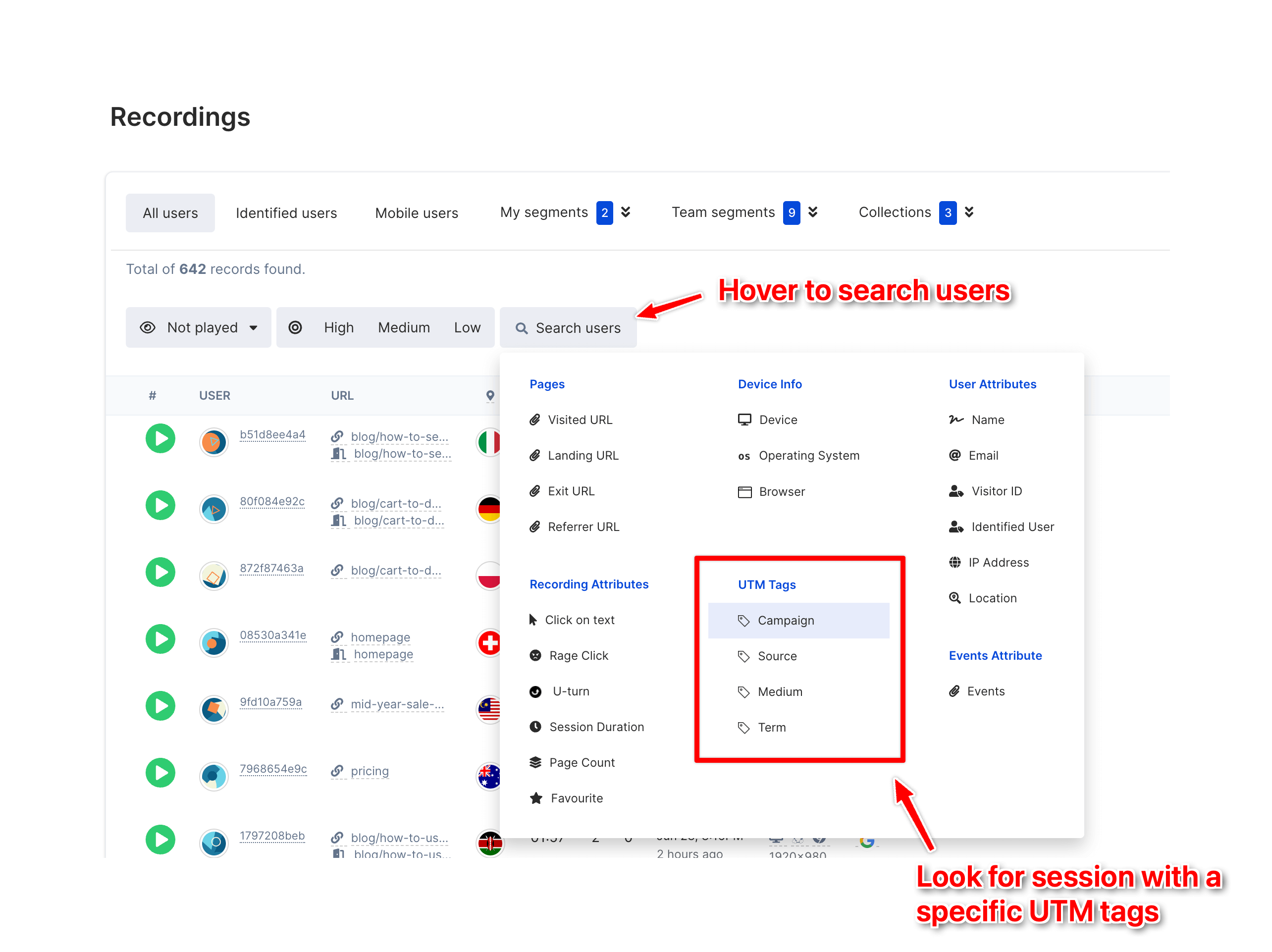 With your UTM tags in place, you can now analyze the performance of your campaigns within Howuku. It will show up in your dashboard under visitor acquisition channels or you can also perform a Session Recording filtering to search for visitors that are coming from a specific campaign.