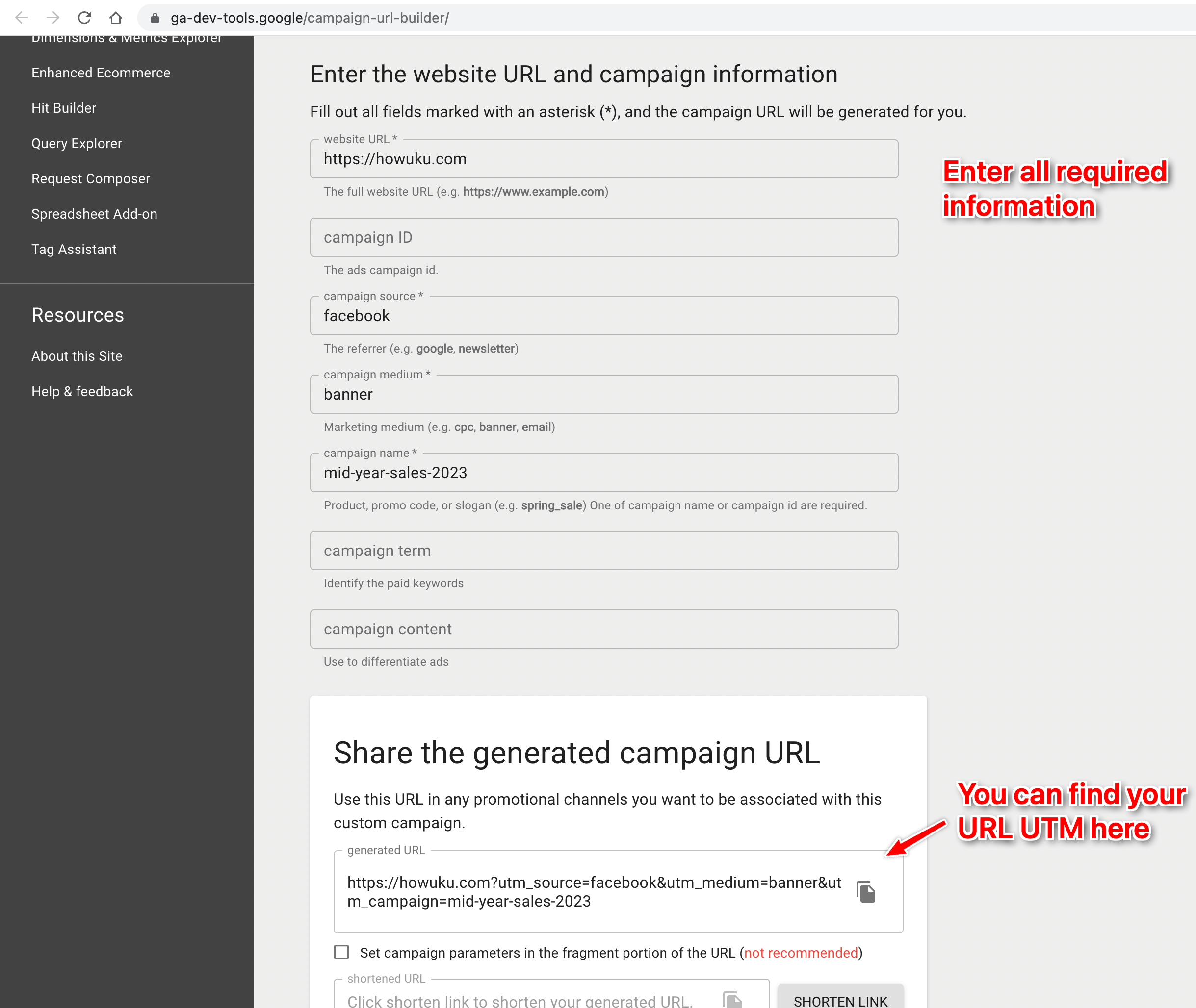 b. Complete the fields for utm_source, utm_medium, and utm_campaign, ensuring the values are descriptive and easy to understand.