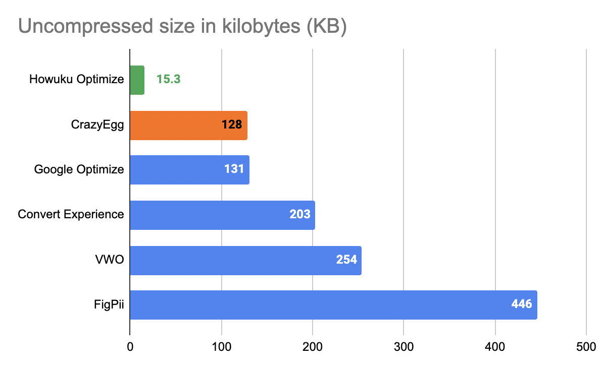 - Google Optimize and CrazyEgg were relatively heavier at 131kb and 128kb respectively